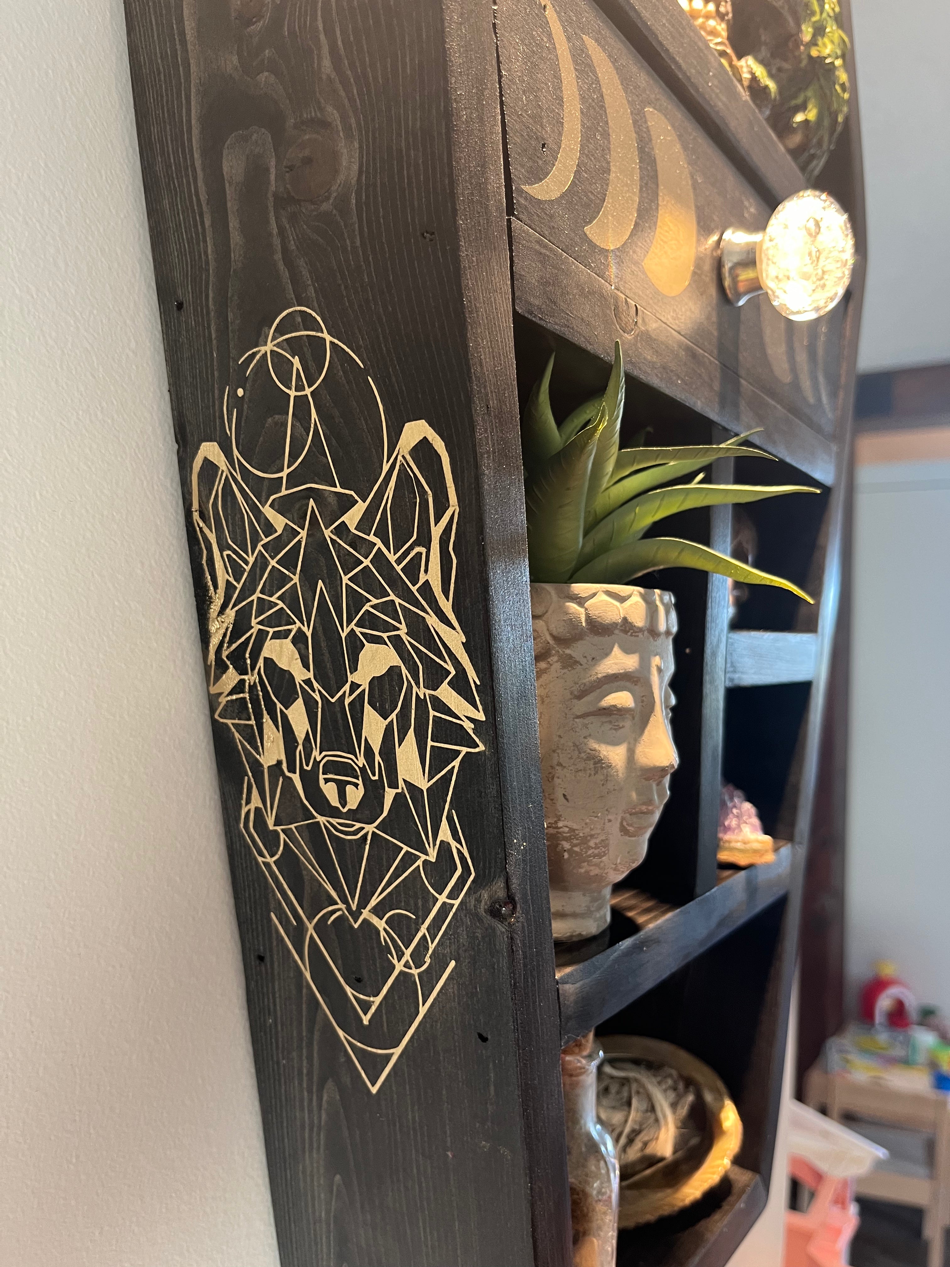 Our handcrafted wood coffin altar shelf with the added element of a large moon phase drawer and original geometric wolf side design.